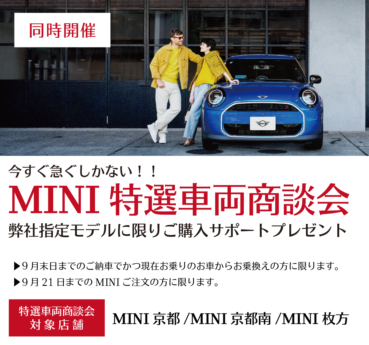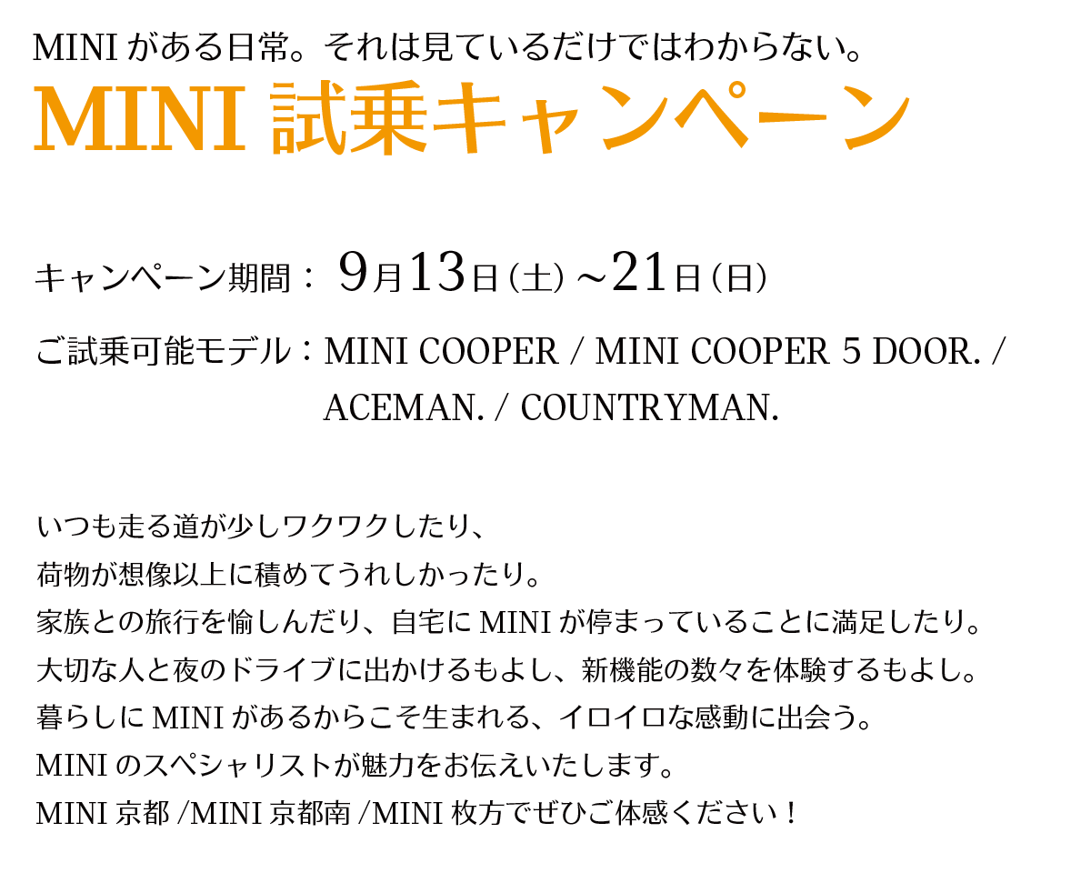 MINI京都南〒612-8452京都市伏見区中島堀端町96TEL : 075-604-4400営業時間:10:00〜18:00定休日:水曜日